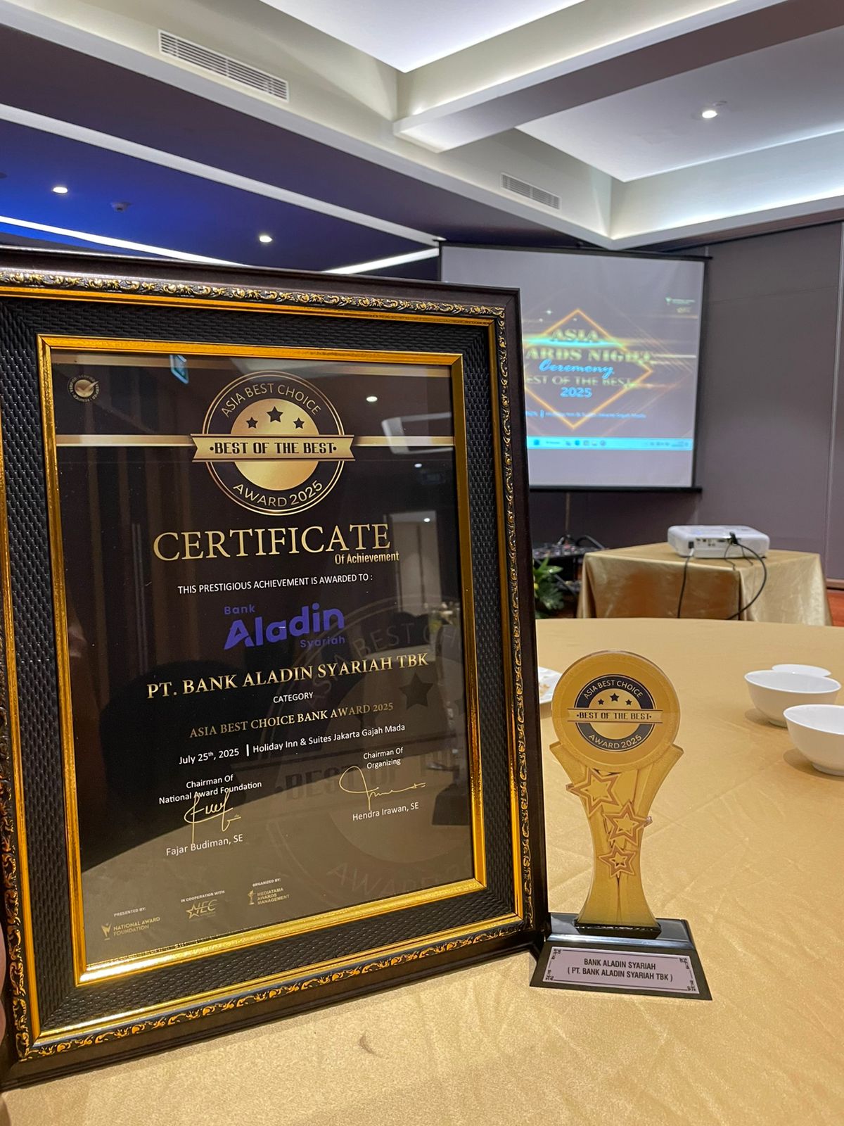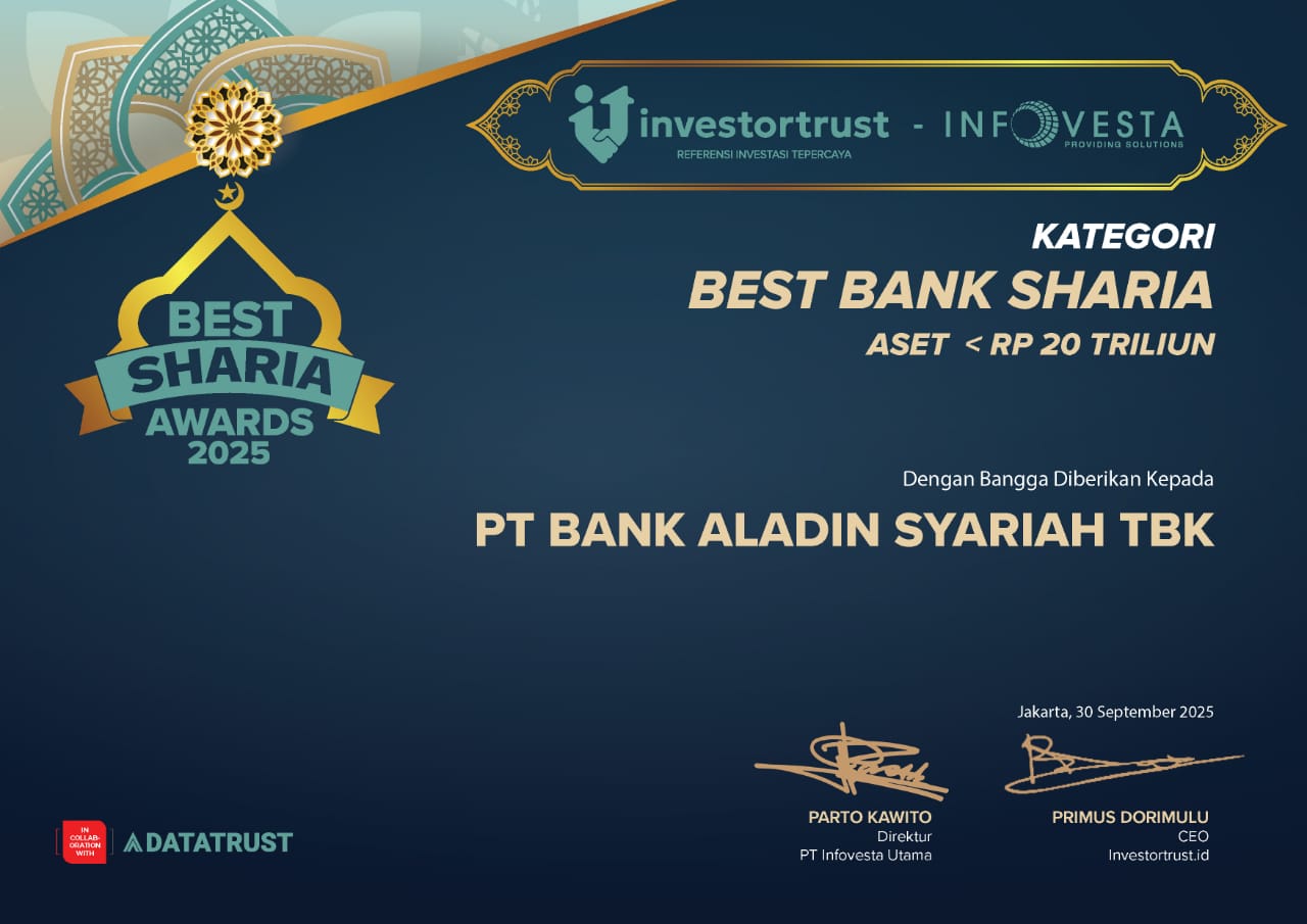 Aladin mendapatkan penghargaan dari Infobank Digital Award 2023 sebagai “The Best Sharia Bank (KBMI) 1 Asset class < 10 T” pada tanggal 12 April 2023