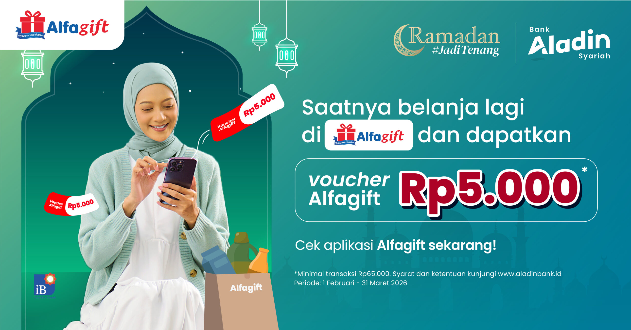 Selamat Anda mendapatkan voucher Alfagift Rp5.000 yang bisa digunakan dengan melakukan transaksi minimum Rp65.000 di aplikasi Alfagift dengan metode pembayaran Bank Aladin Syariah.